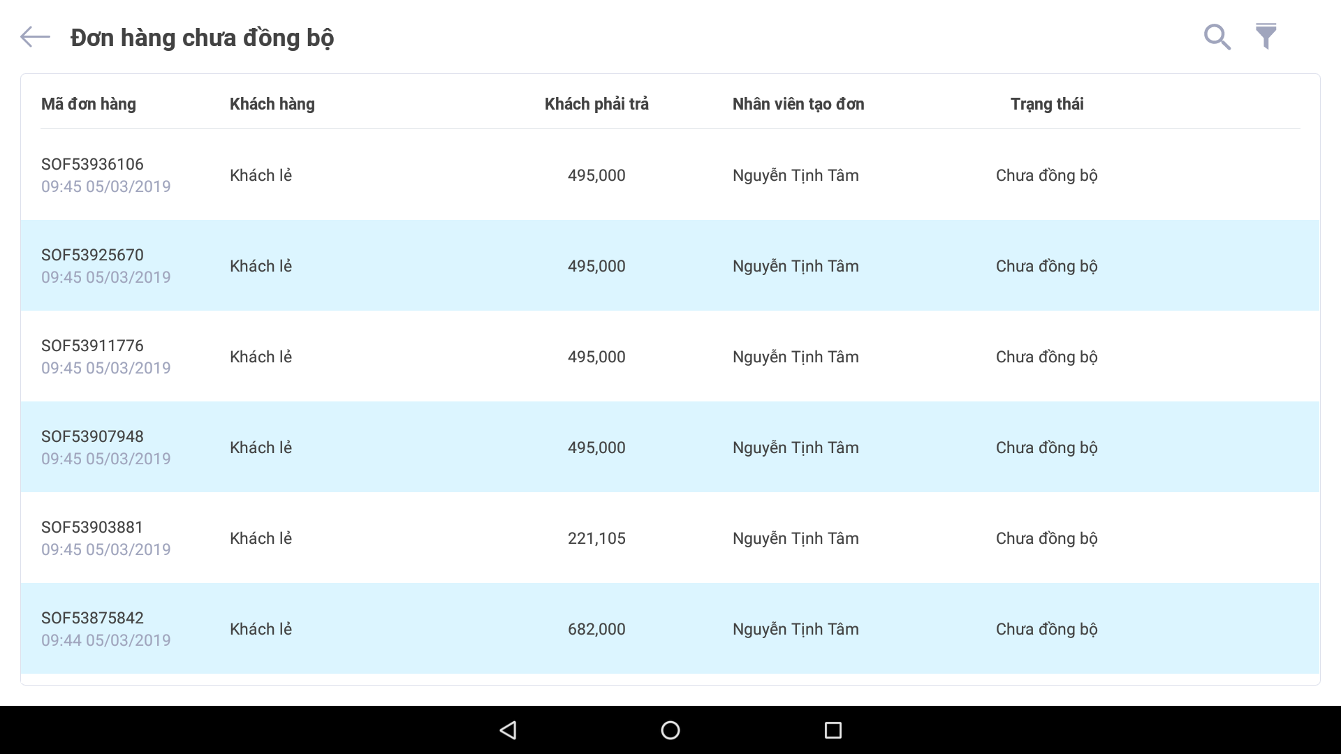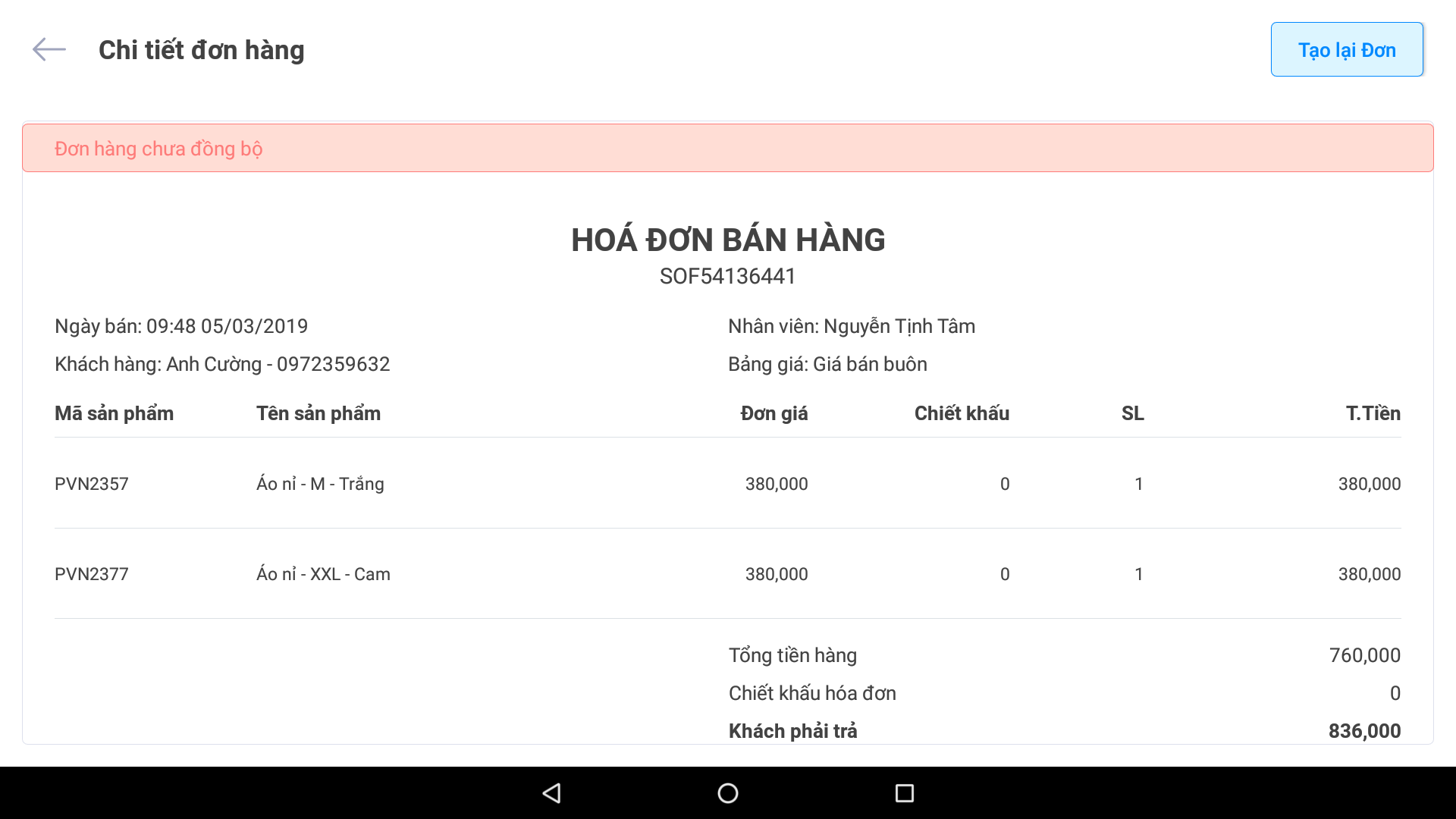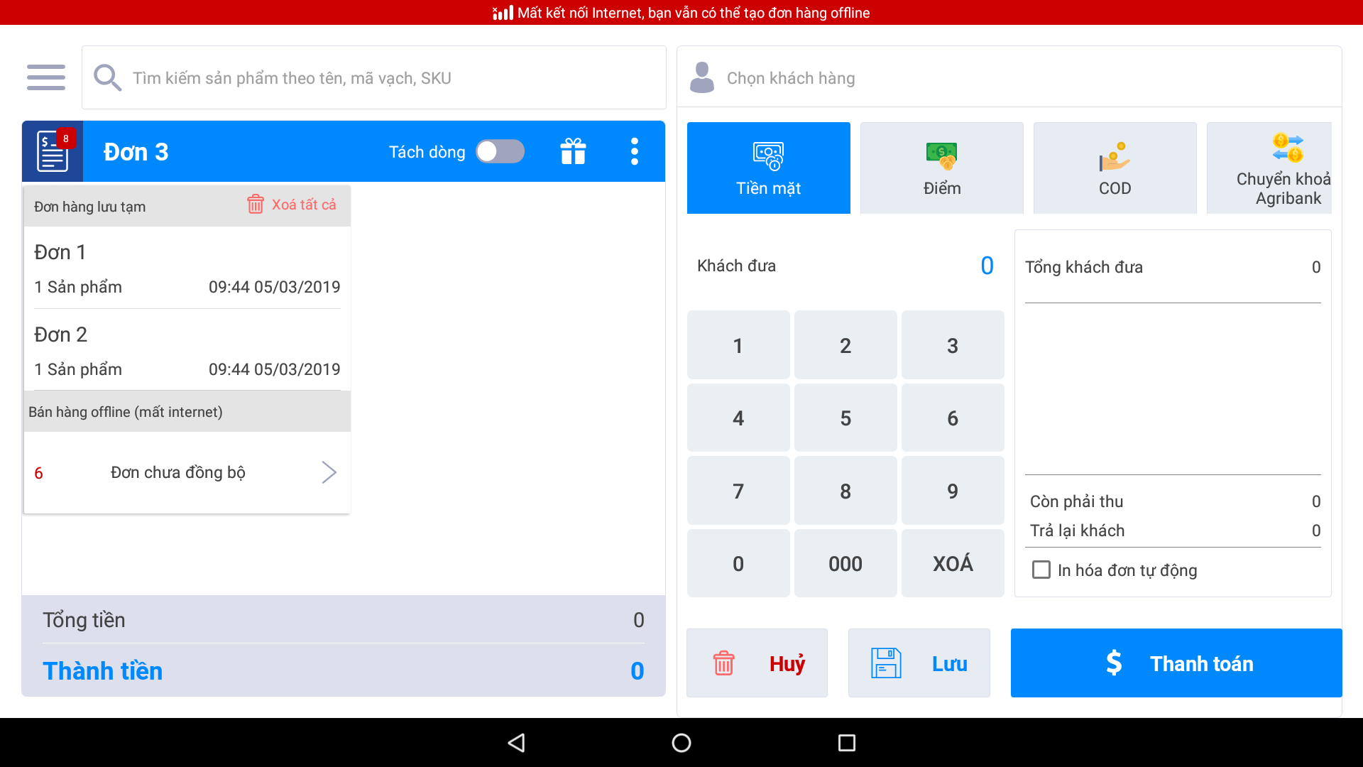 Khi chuyển về màn hình này thì nhân viên có thể thao tác bán hàng tạo đơn hàng và thanh toán bình thường. Mọi đơn hàng sẽ được lưu lại trên máy và đồng bộ lên hệ thống khi có kết nối internet trở lại.