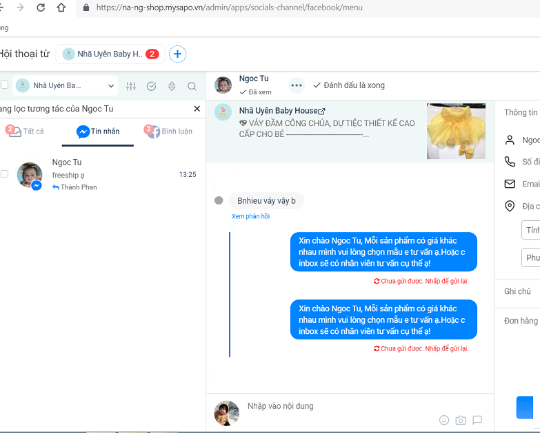 Nếu bạn tiếp tục rep tiếp khi khách chưa trả lời, hệ thống sẽ báo lỗi Chưa gửi được tin nhắn như trên