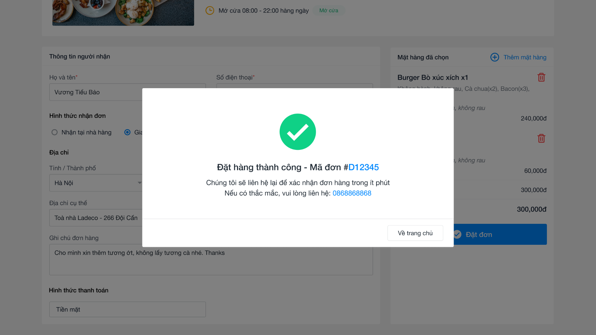 - Sau khi đặt đơn thành công, khách hàng sẽ nhận được thông tin mã đơn để kiểm tra về sau
