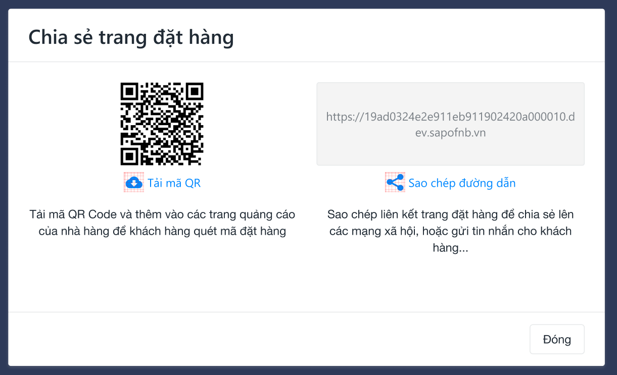 Bạn có thể chia sẻ trang bán hàng thông qua mã QR được tạo hoặc sao chép đường dẫn để gửi cho khách hàng