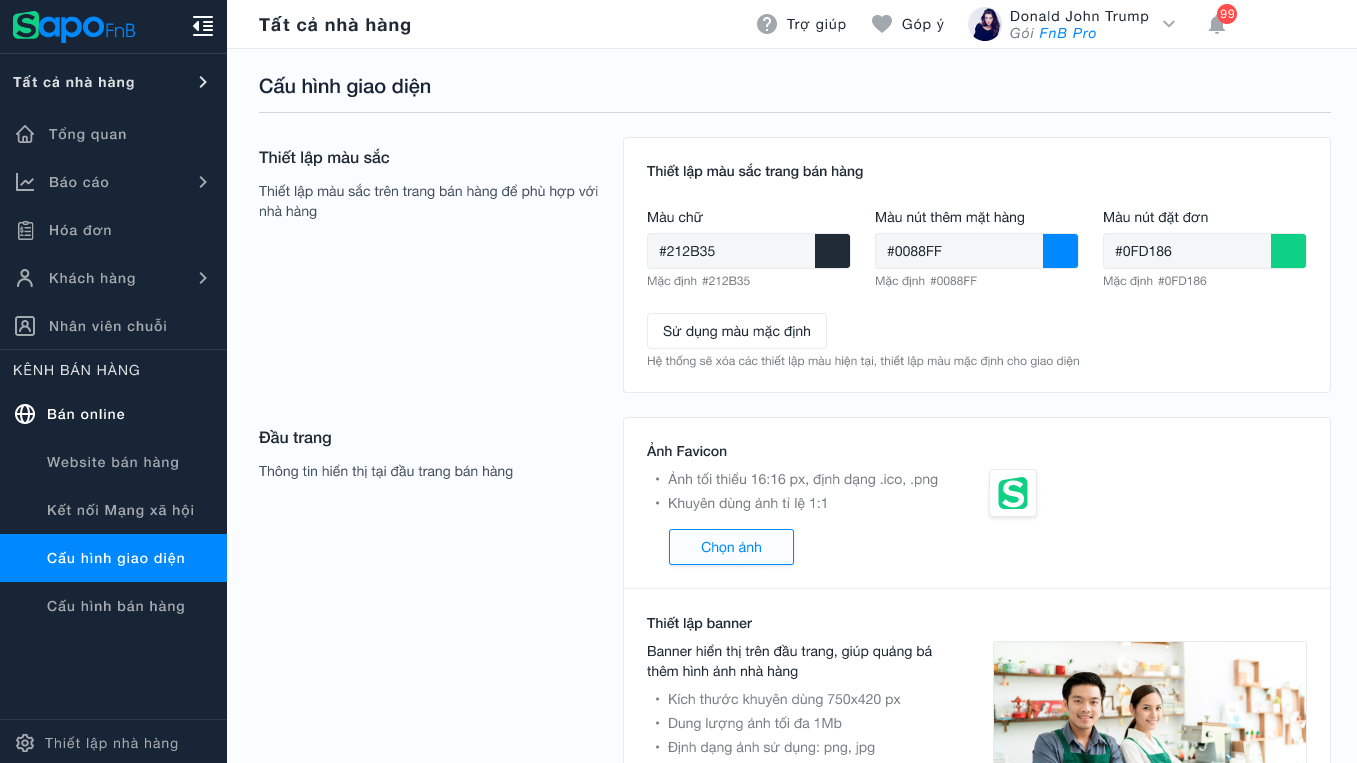 Tính năng bán online hỗ trợ cho các khách hàng sử dụng gói dịch vụ Sapo FnB Pro. Nếu bạn đang sử dụng gói dịch vụ FnB Basic, bạn có thể liên hệ tổng đài 1900 6570 để được kết nối tới chuyên viên hỗ trợ nâng cấp.