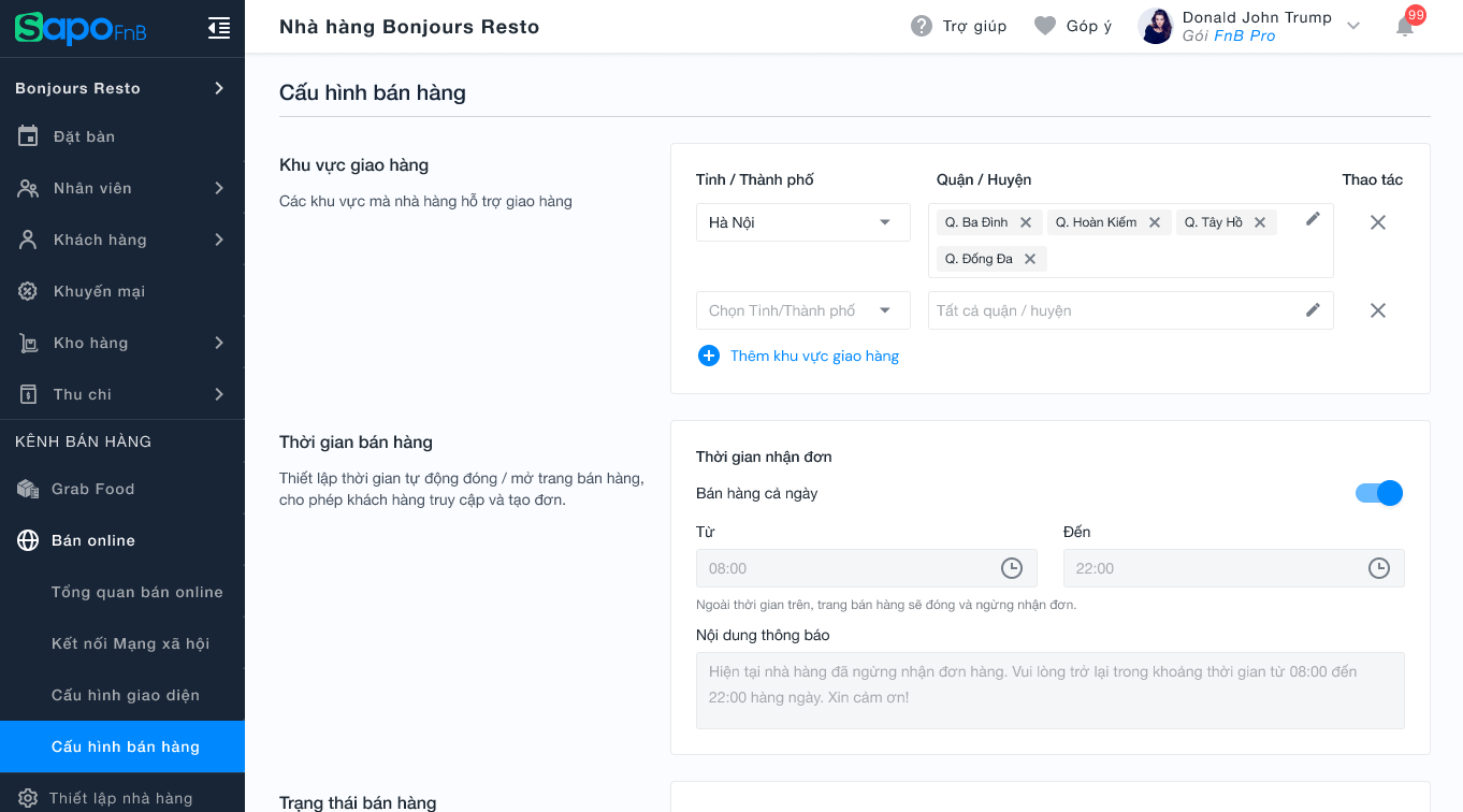 - Thiết lập thời gian bán hàng của nhà hàng, hoặc thiết lập dừng nhận đơn cho tới khi nhà hàng sẵn sàng nhận đơn lại.