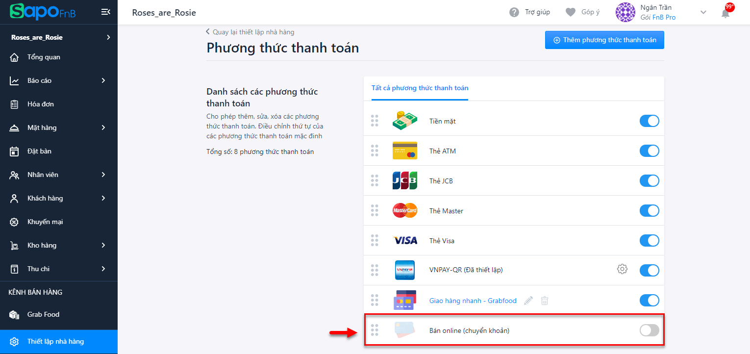 Phương thức Bán online (chuyển khoản) sẽ là 1 phương thức mặc định tương tự như những phương thức khác, nhà hàng có thể: