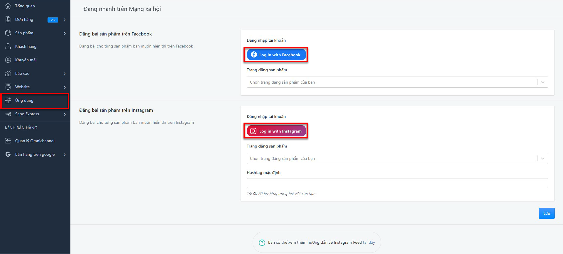 - Bước 1: Bạn truy cập vào trang quản trị > Ứng dụng > Đăng nhanh trên Mạng xã hội > Đăng nhập vào tài khoản Facebook hoặc Instagram