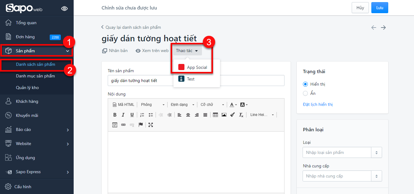 - Bước 1:  Sau khi hoàn tất cài đăt, để đăng bài cho sản phẩm bạn truy cập và phần mềm > Sản phẩm > Danh sách sản phẩm > Chọn sản phẩm muốn đăng > Thao tác > app Đăng nhanh sản phẩm