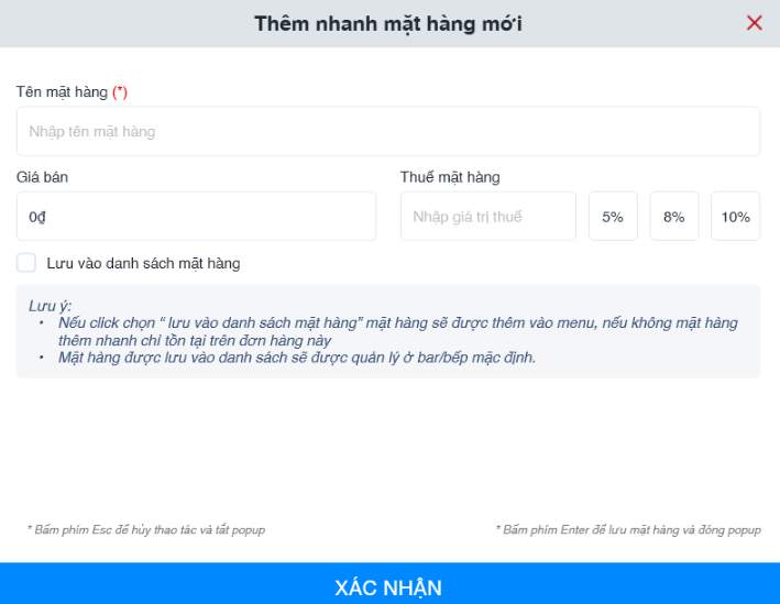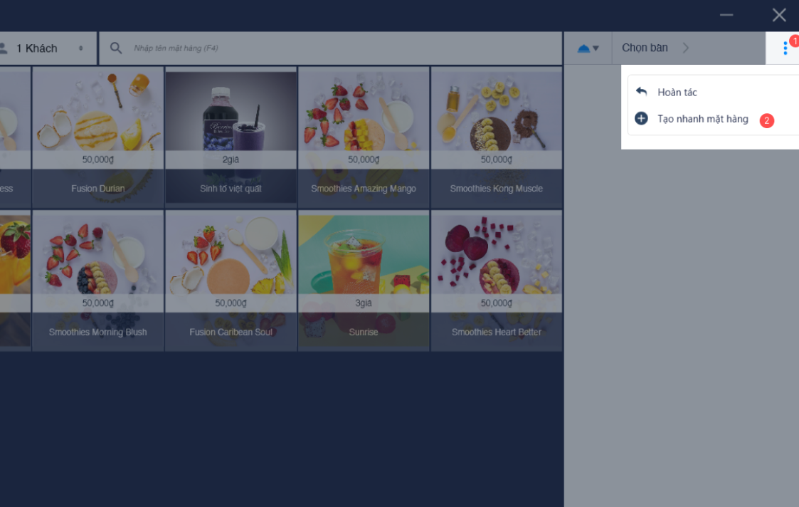 > Chọn Tạo nhanh mặt hàng