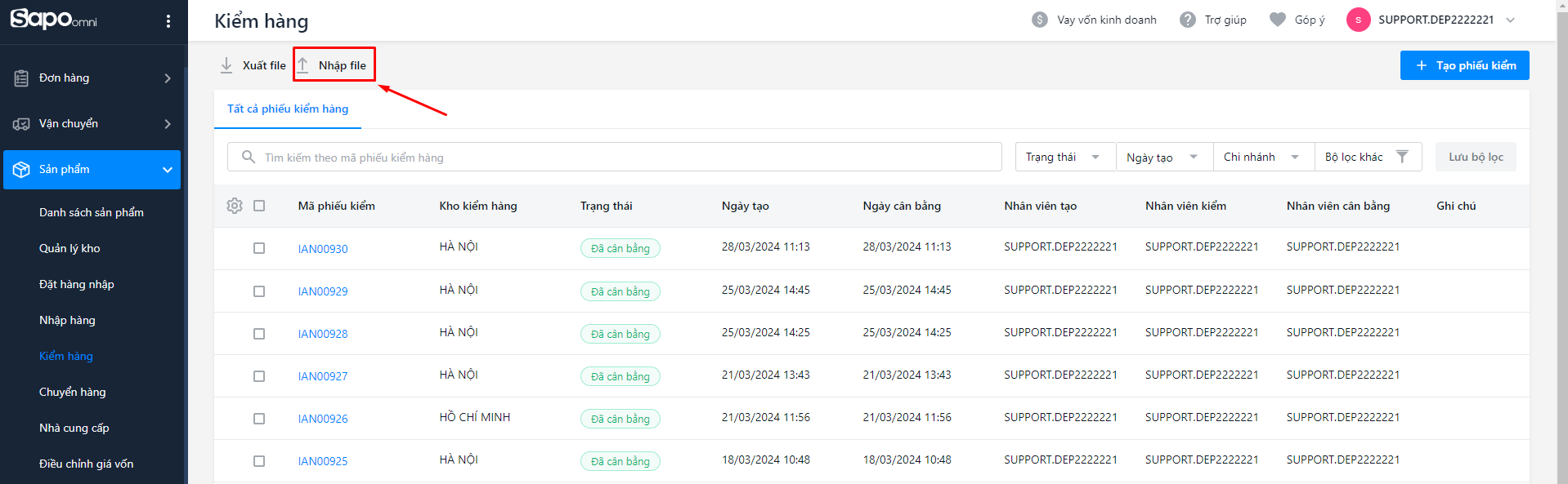 Hệ thống sẽ tạo một phiếu nhập hàng ở trạng thái Đang kiểm hàng. Bạn vào phiếu và nhấn cân bằng kho như các bước tạo phiếu kiểm hàng thông thường.