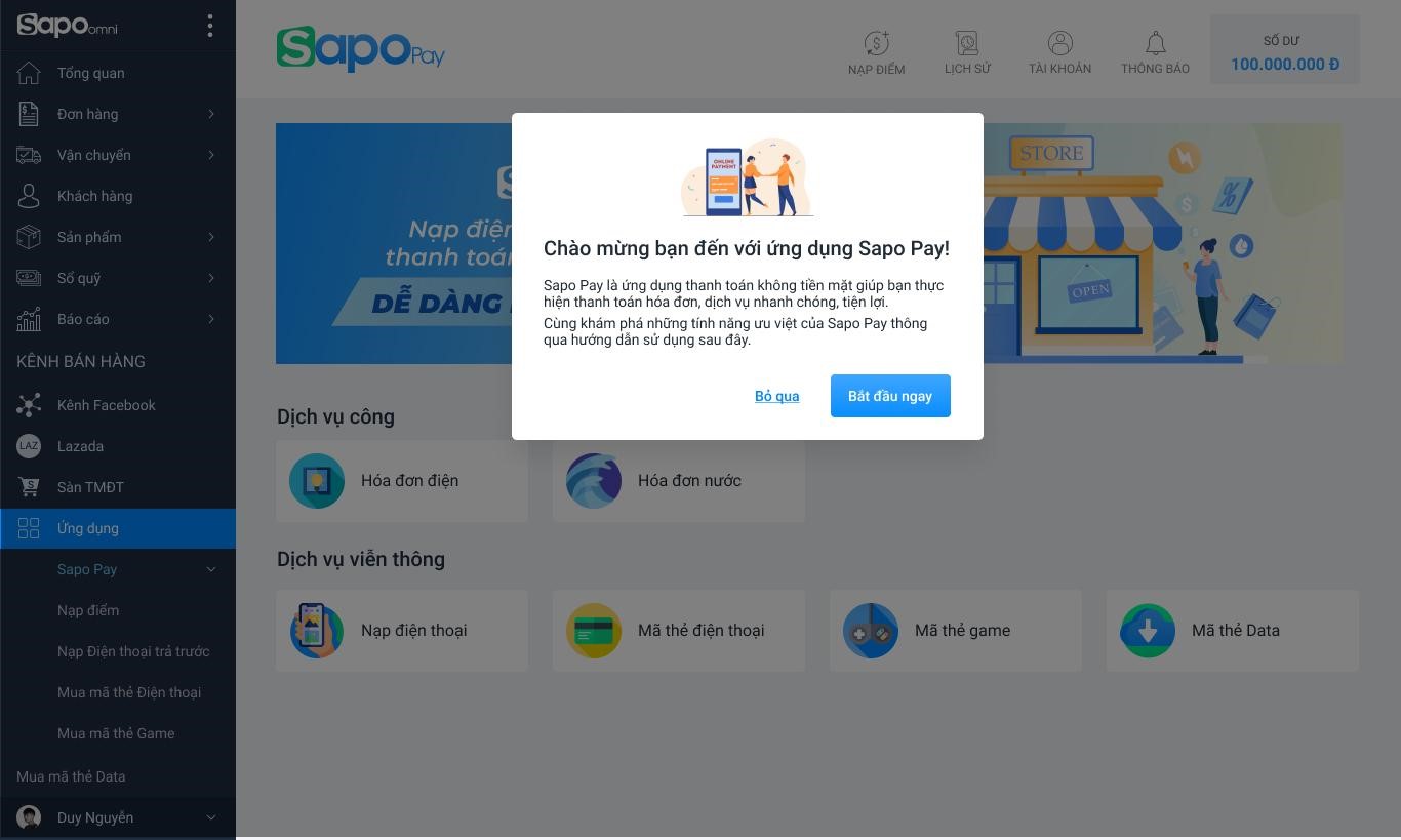 Sau khi cài đặt thành công ứng dụng Sapo Pay, để truy cập vào ứng dụng bạn chọn Ứng dụng > Sapo Pay. Hộp thoại Chào mừng bạn đến với ứng dụng Sapo Pay được hiển thị