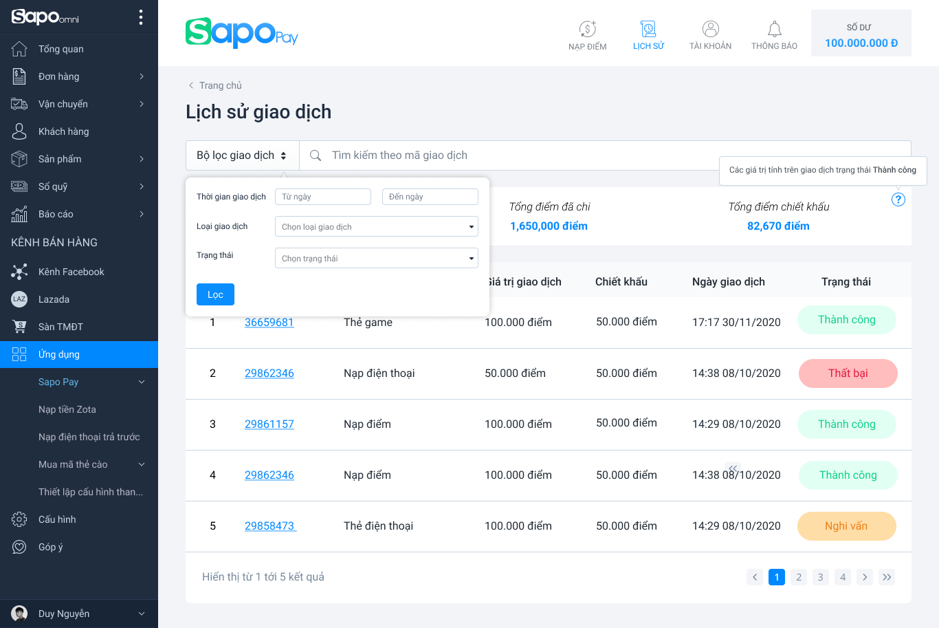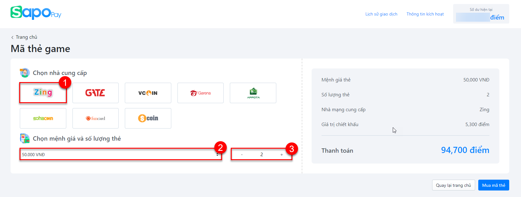 - Loại giao dịch (Nạp điểm/Nạp điện thoại/Mua mã thẻ điện thoại/Mã thẻ game/Mã thẻ data)