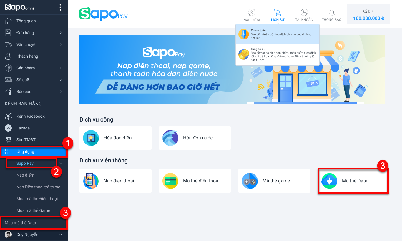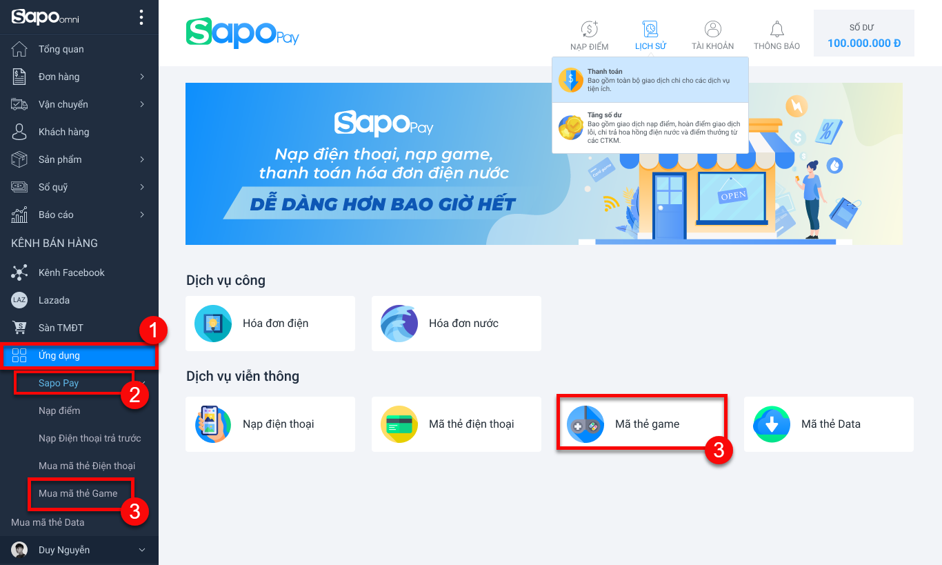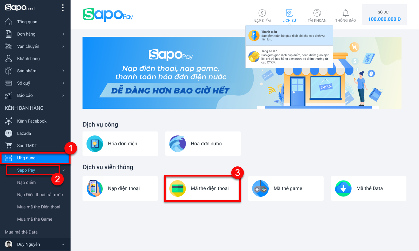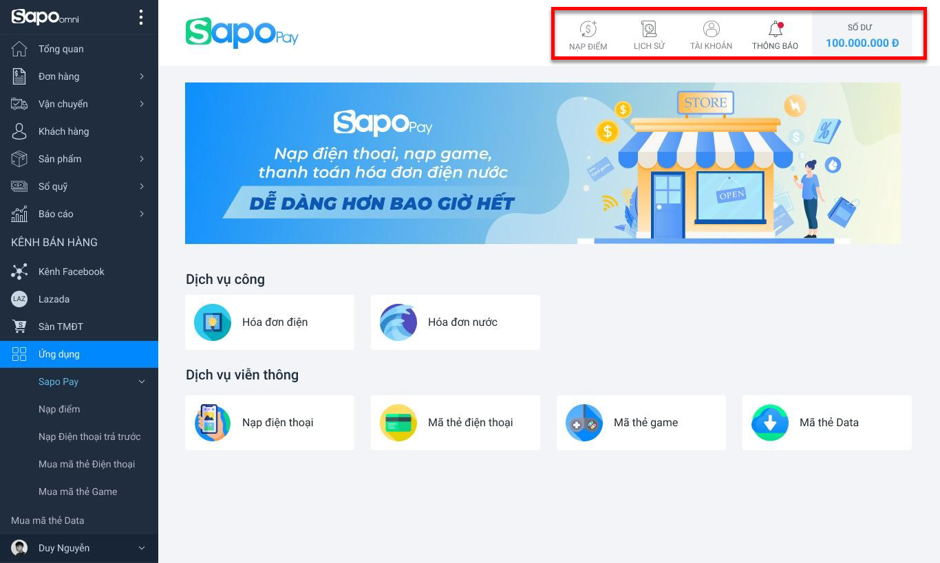 Để sử dụng các dịch vụ tiện ích của Sapo Pay, tại trang quản trị phần mềm quản lý bán hàng Sapo bạn thao tác như sau:
