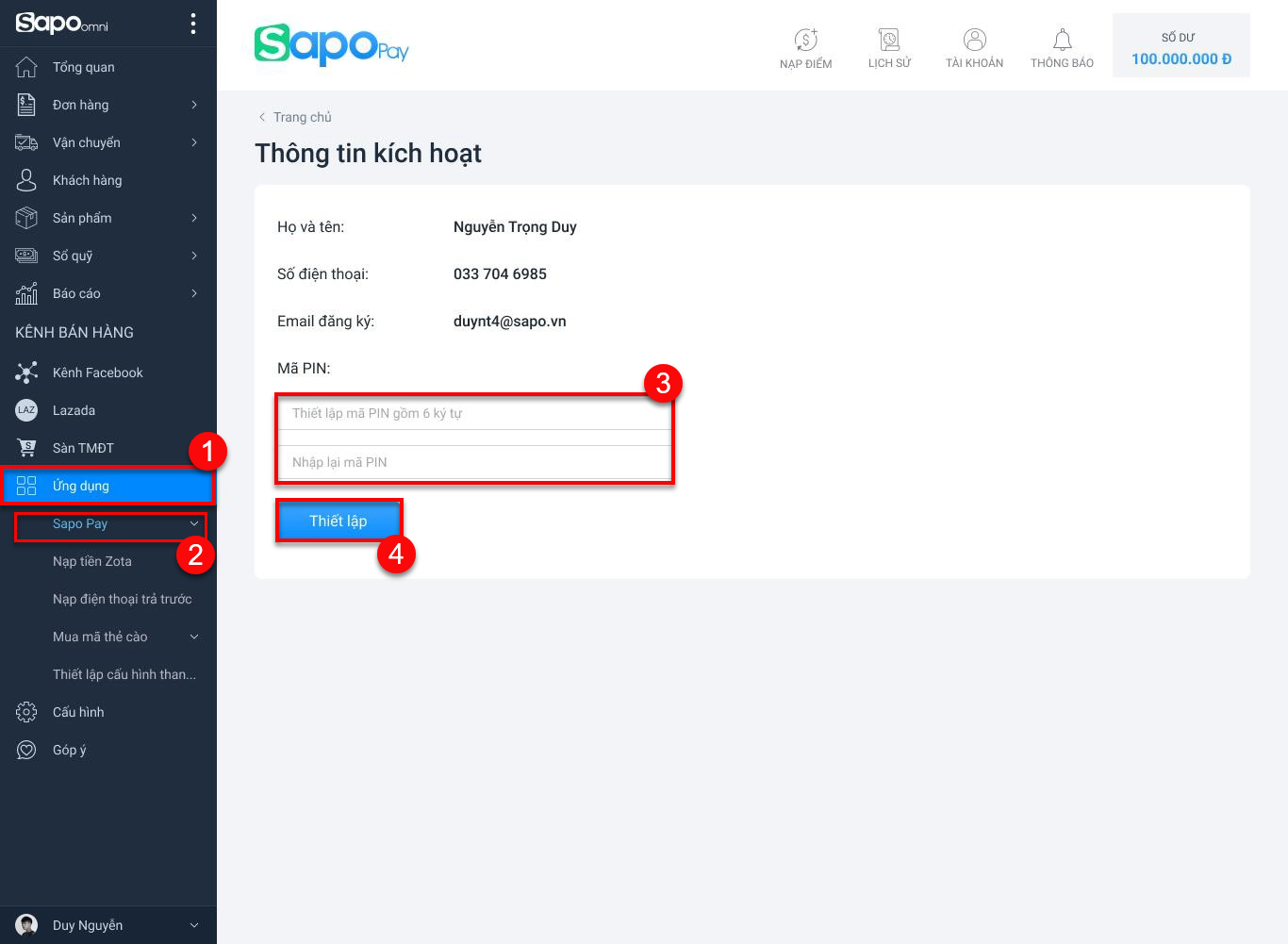 Để thiết lập mã Pin lần đầu, bạn chọn Ứng dụng > Sapo Pay > Tài khoản > nhập mã PIN vào ô Thiết lập mã PIN gồm 6 ký tự và nhập lại mã PIN > chọn Thiết lập
