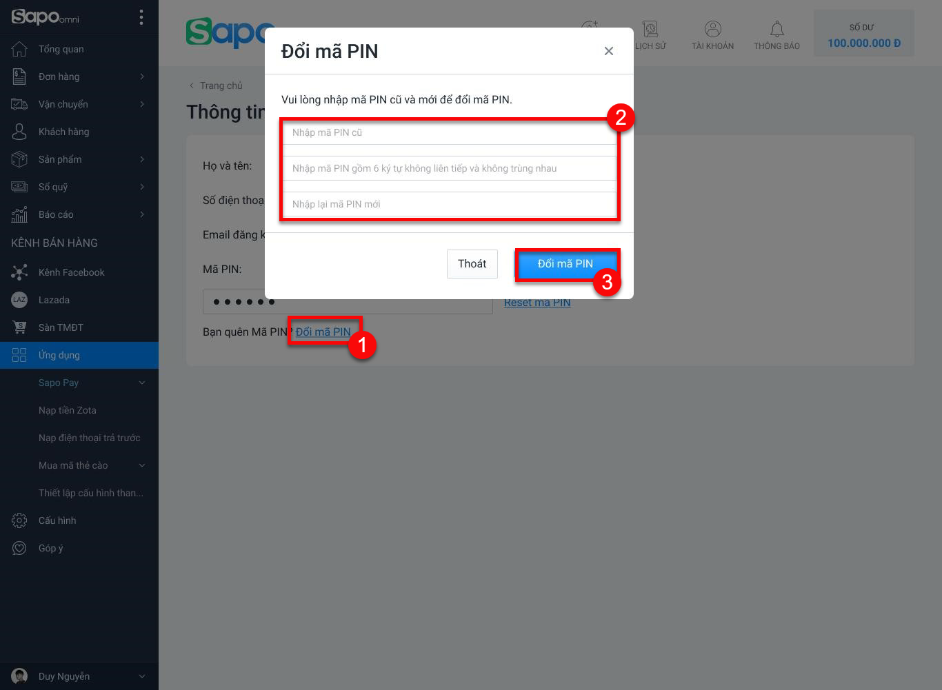 - Tài khoản: Hiển thị thông tin đăng ký tài khoản với Sapo Pay, các thao tác thiết lập mã PIN, đổi mã PIN (Mã PIN dùng để bảo mật và xác thực giao dịch)