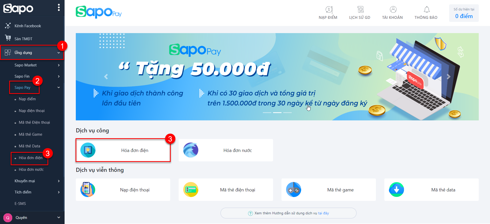Tại trang quản trị Sapo, bạn thao tác Nạp điểm theo các bước sau: