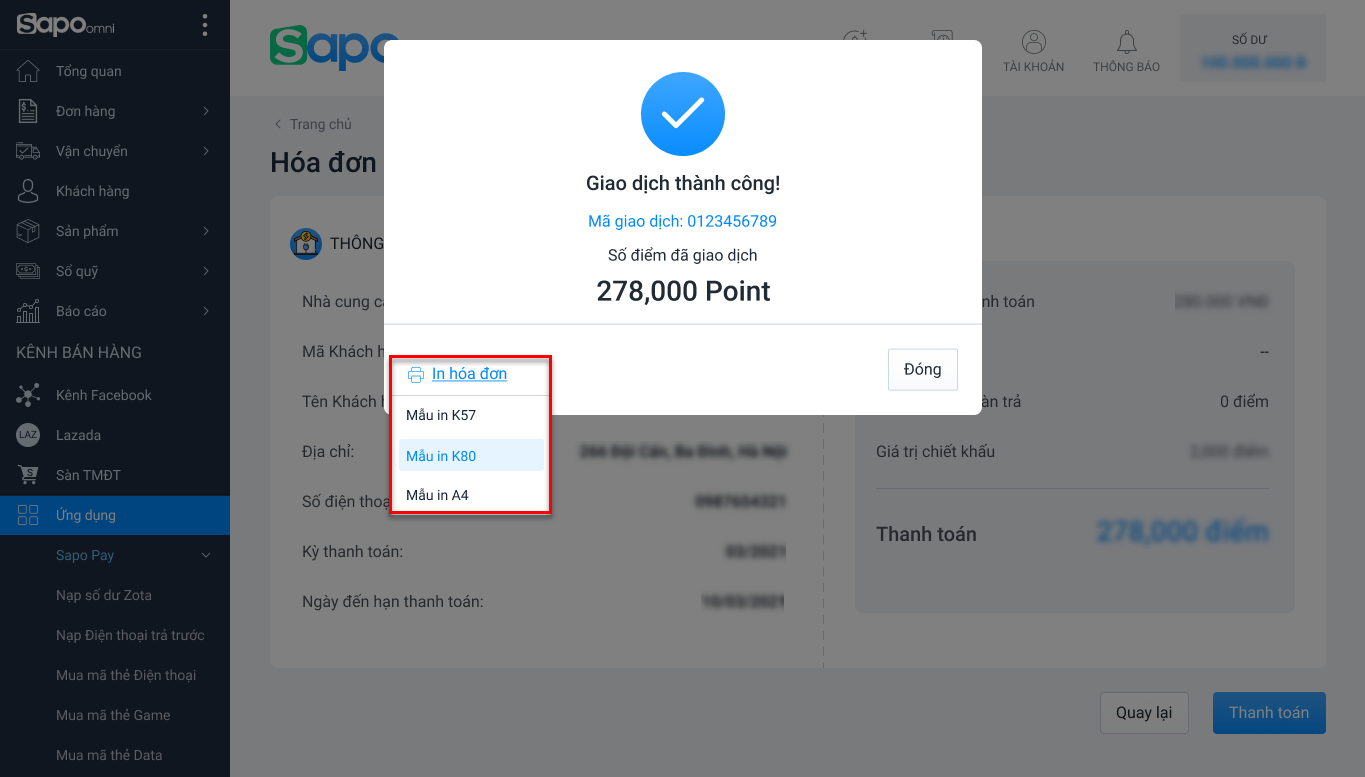 Sau khi thanh toán thành công, hệ thống sẽ hiển thị ra hộp thoại Giao dịch thành công. Lúc này, bạn click vào mục In hóa đơn > chọn khổ giấy cần in để thực hiện in hóa đơn giao cho khách hàng