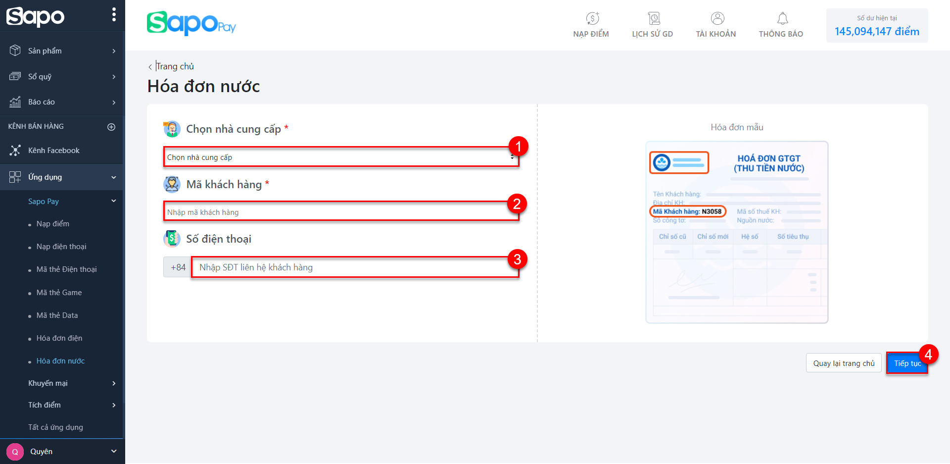 - Bước 2: Bạn chọn Nhà cung cấp / nhập mã khách hàng / nhập số điện thoại liên hệ của khách hàng > chọn Tiếp tục