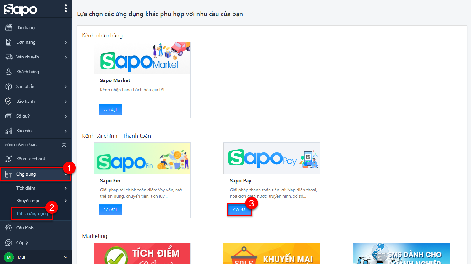 - Bước 1: Tại trang quản trị phần mềm quản lý bán hàng Sapo, bạn chọn Ứng dụng > Tất cả ứng dụng > ở mục Kênh tài chính - Thanh toán bạn chọn Cài đặt Sapo Pay
