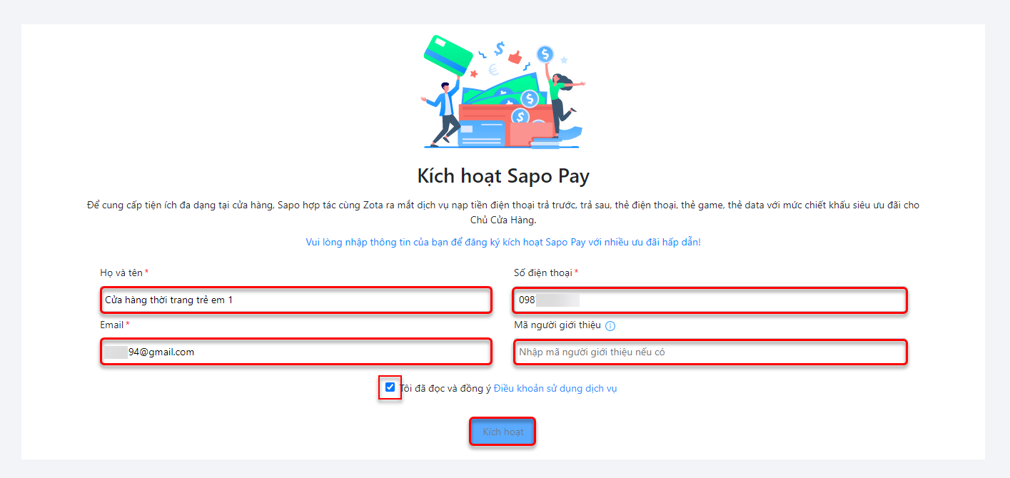 - Bước 2: Nhập các thông tin đăng ký sử dụng > nhấn vào checkbox "Tôi đã đọc và đồng ý Điều khoản về sử dụng dịch vụ", > chọn Kích hoạt
