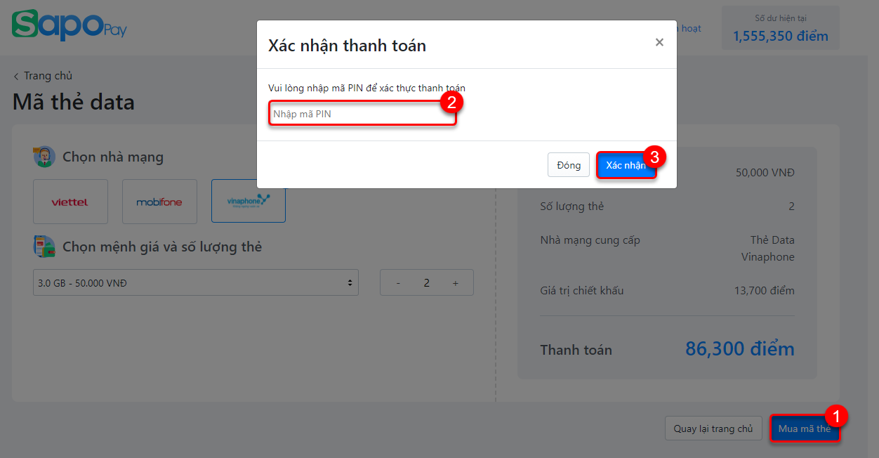 Phần mềm sẽ hiển thị ra hộp thoại xác nhận thanh toán, bạn cần nhập mã PIN để thực hiện thanh toán > sau đó chọn Xác nhận để hoàn tất. Bạn cần nhập đúng mã PIN để giao dịch thực hiện thành công.