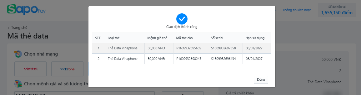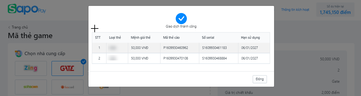 Sau khi giao dịch được thực hiện thành công, phần mềm sẽ hiển thị hộp thoại cung cấp các mã thẻ bạn mua. Các thông số bao gồm: Loại thẻ, mệnh giá thẻ, mã thẻ cào, số serial và hạn sử dụng.
