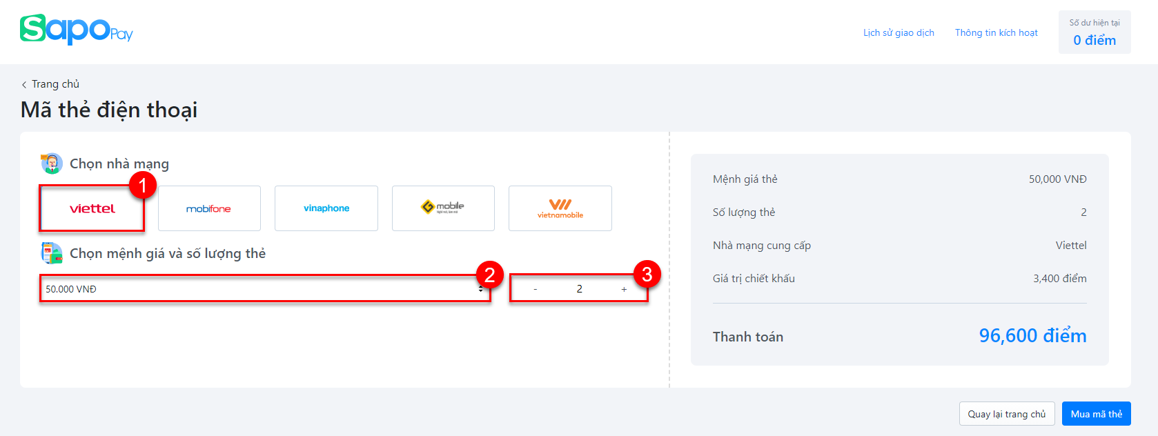 Sau khi bạn nhập và lựa chọn xong các thông tin giao dịch, các thông tin sẽ được hiển thị ở bên phải kèm theo giá trị chiết khấu bạn được hưởng và số điểm sẽ cần thanh toán.