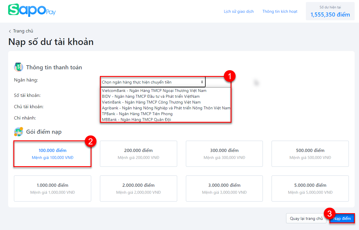 Màn hình nạp điểm hiện ra, bạn chọn ngân hàng thụ hưởng để nạp điểm. Danh sách các ngân hàng thụ hưởng mà Sapo Pay hỗ trợ bao gồm: