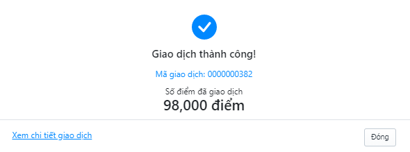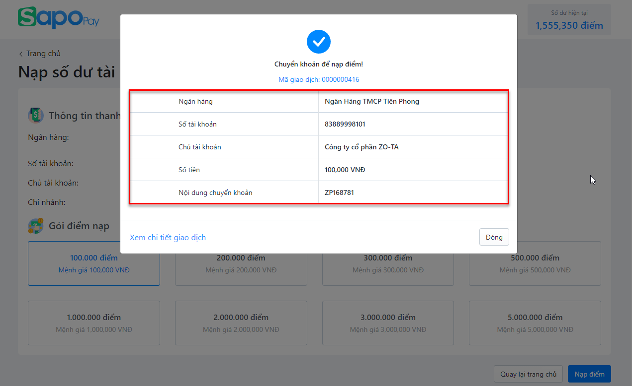 Sau khi chuyển khoản, bạn có thể “Đóng” để thoát màn hình nạp điểm hoặc bạn có thể nhấn vào liên kết “Xem chi tiết giao dịch” để kiểm tra trạng thái nạp điểm